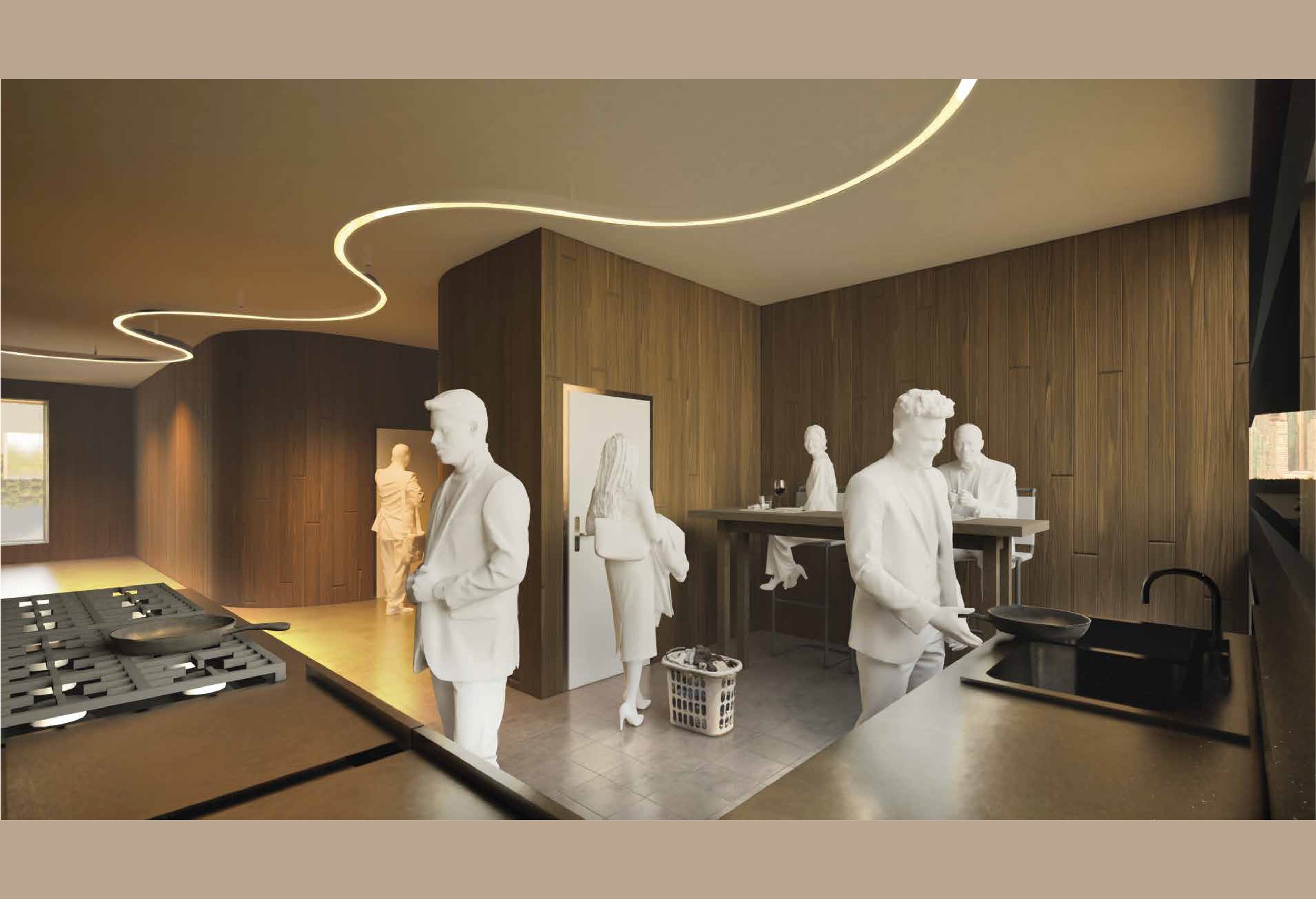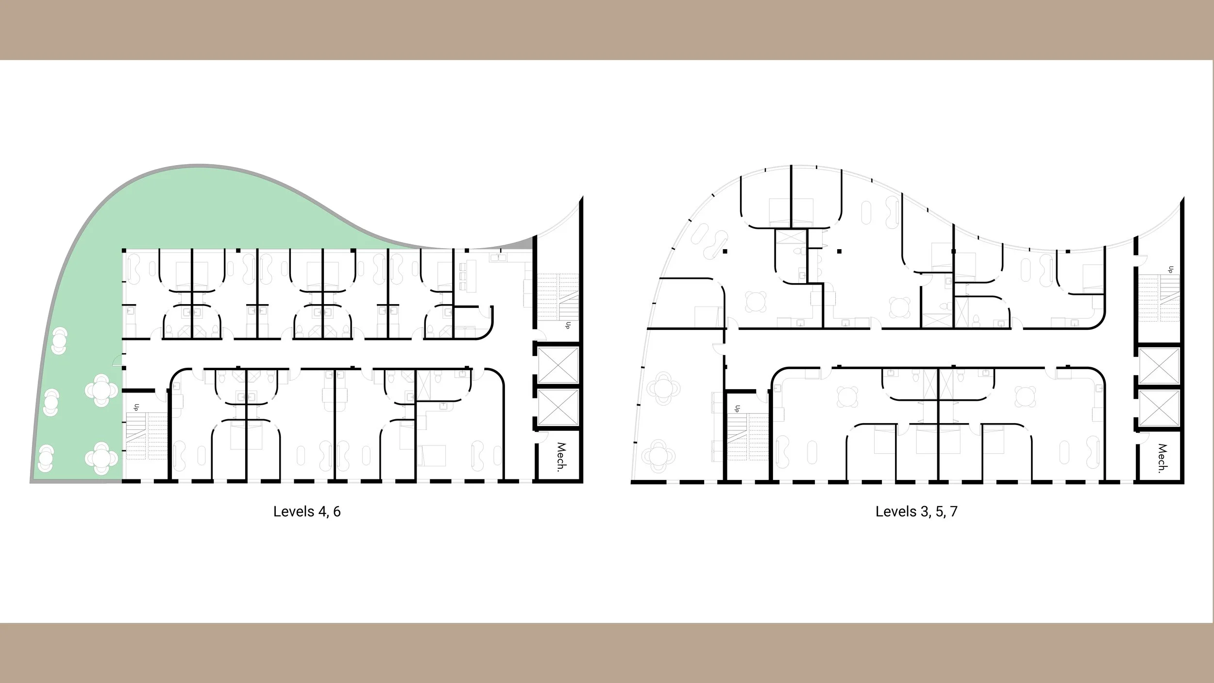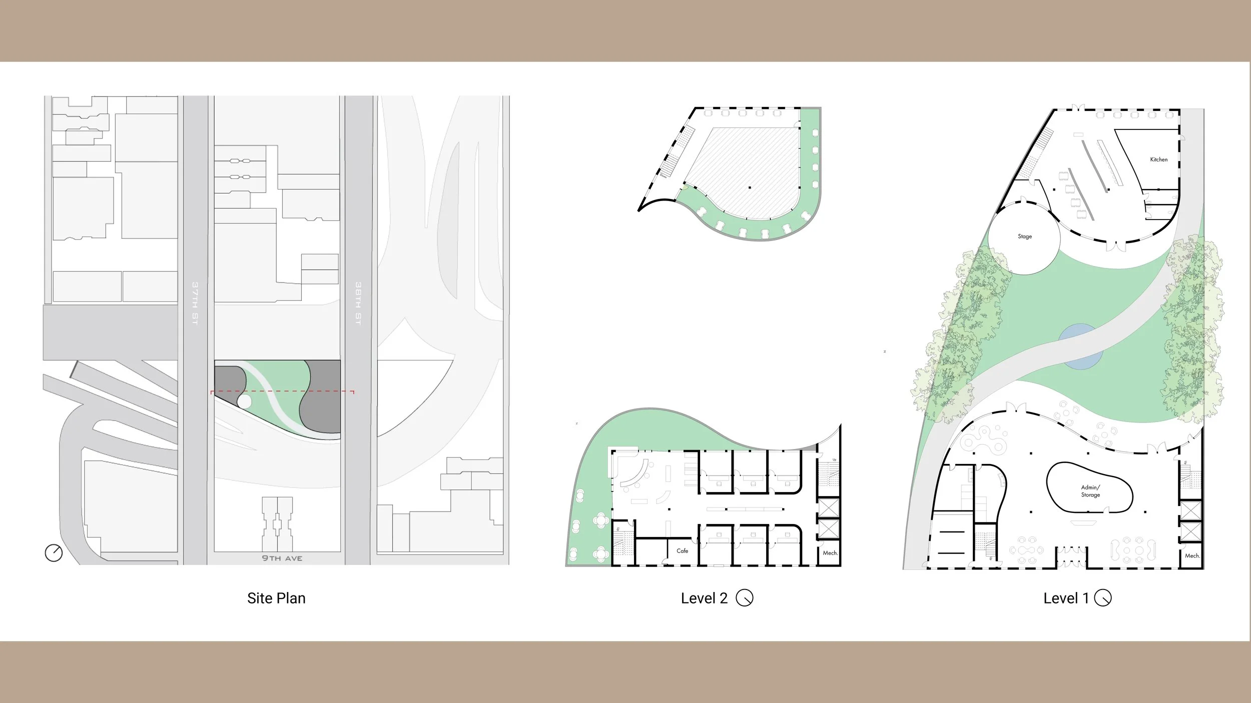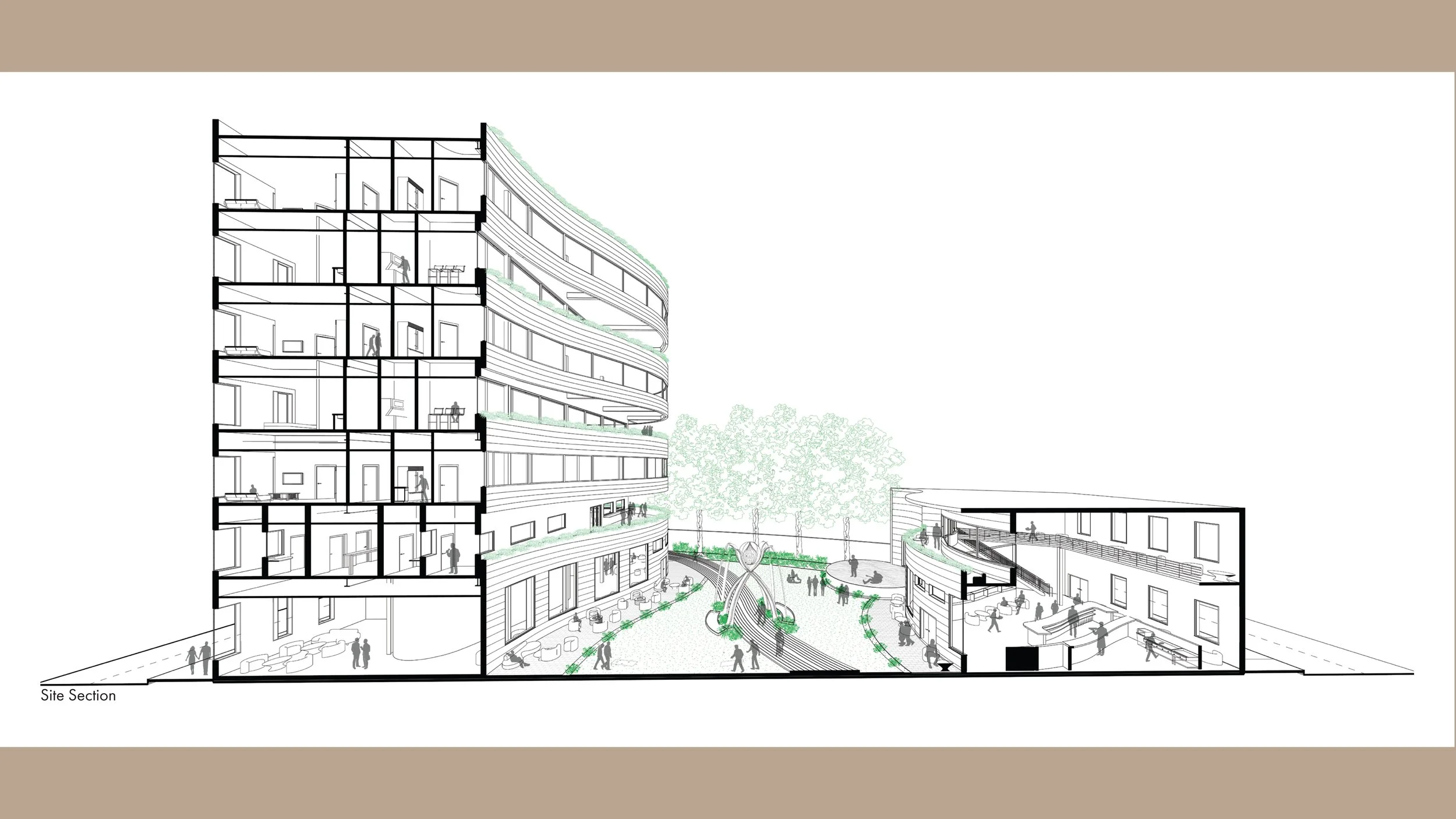 Partnered with Johnathan Ramirez, tasked with creating a mixed-use mid-rise building on a site located in New yorks between Hudson Yards and Hell’s Kitchen. The building program consisted of single- and multi-family residences, along with commercial and public entertainment spaces, with a focus on engaging with the community and the surrounding area. We chose the curvilinear form based on the site's shape and split the program between two curved forms that speak to each other, with a blossoming public center space between them. Because we had to design the building for a fixed number of units, we kept the building's core rectilinear, and the excess curvature was expressed as shared balcony spaces on every other level. The massing and program strategy create an intimate, isolated space while also allowing the community to engage in events and pass through the site. Within the program, we intentionally created many shared spaces and activated corridors to encourage interaction and foster community among residents.