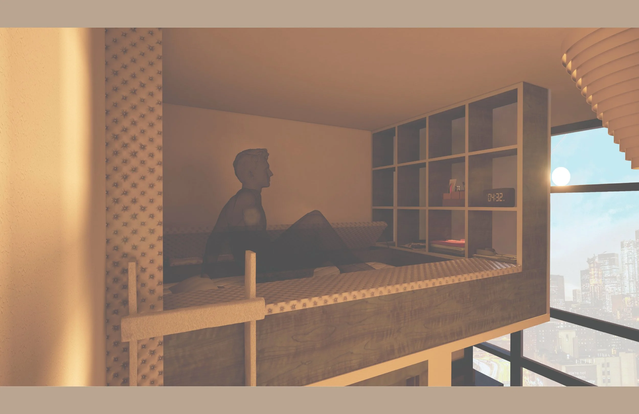 Tasked with creating an 8’ x 8’ x 12’ space focused on creating a smart, efficient plan within a small space as a prologue to the mixed-use project in Manhattan. The space was to be designed for an artist and to include a fitness area. The space was supposed to have drawn inspiration from a famous artist or architect; I was assigned Alvar Aalto. I choose to create a simple, efficient plan with many operable pieces to maximize space. The artist I chose was a vocalist who decided to create one room for both functions, using leather-finished foam padding for soundproofing and a comfortable yoga space. To bring some of Aalto’s principles into the project, I chose simple, natural materials with a neutral palette, focusing on human-centered design, and incorporated some of his furniture and lighting fixtures.